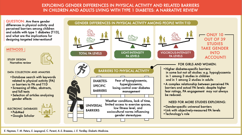 Heyman E, Peters MT, Lespagnol E, Parent C, Brazeau A-S, Yardley J. Exploring gender differences in physical activity and related barriers in children and adults living with type 1 diabetes: a narrative review. Diab Med 2025.